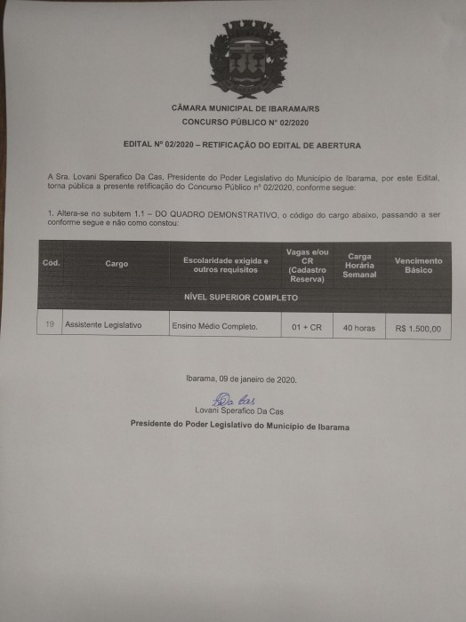 Edital 02/2020 - Retificação do Edital de Abertura do Concurso Público Nº02/2020 Câmara Ibarama
