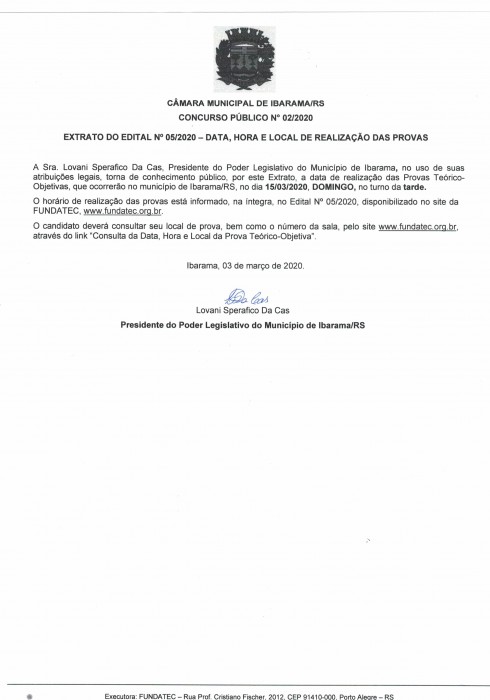 Extrato de Edital nº 05/2020 - Data, Hora e Local da realização das provas.