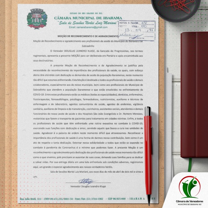 Moção de Reconhecimento e agradecimento aos profissionais da saúde do Município de Ibarama e de Sobradinho